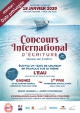 En cette période où toute la planète est affectée par un virus qui ne connait pas les frontières, toute l’équipe de CHANSONS SANS FRONTIERES reste mobilisée pour que cette belle aventure continue. L’EAU était le thème de cette 14e édition en lien avec « Dis-moi dix mots au fil de l’eau » Planète Bleue, de la mer au ciel, du ciel à la terre et de la terre à la mer, le voyage de l’eau recommence à l’infini. Ecosystème, sécheresse ou inondation, pollution et pénurie… L’eau nous constitue, elle nous entoure, chante à nos oreilles, elle est la vie. Liquide, solide ou gazeuse, …
