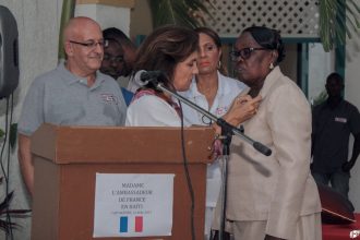 | Le 12 mai dernier, la Petite Ecole, le Lycée Philippe Guerrier et le Collège Notre Dame recevaient l’ambassadeur de France en Haïti. Après ces visites du monde scolaire, c’est à l’ONPH, à la CCI, à l’hôpital Justinien, à la Délégation du Nord, à la mairie et à l’archevêché qu’elle se rendait. De retour à l’Alliance Française, après avoir remis des plaques d’honneur aux 15 établissements et associations partenaires, elle décorait Mme Marie-Ginette Périclès Lorfils de la médaille de l’Ordre des Palmes Académiques au grade d’officier.