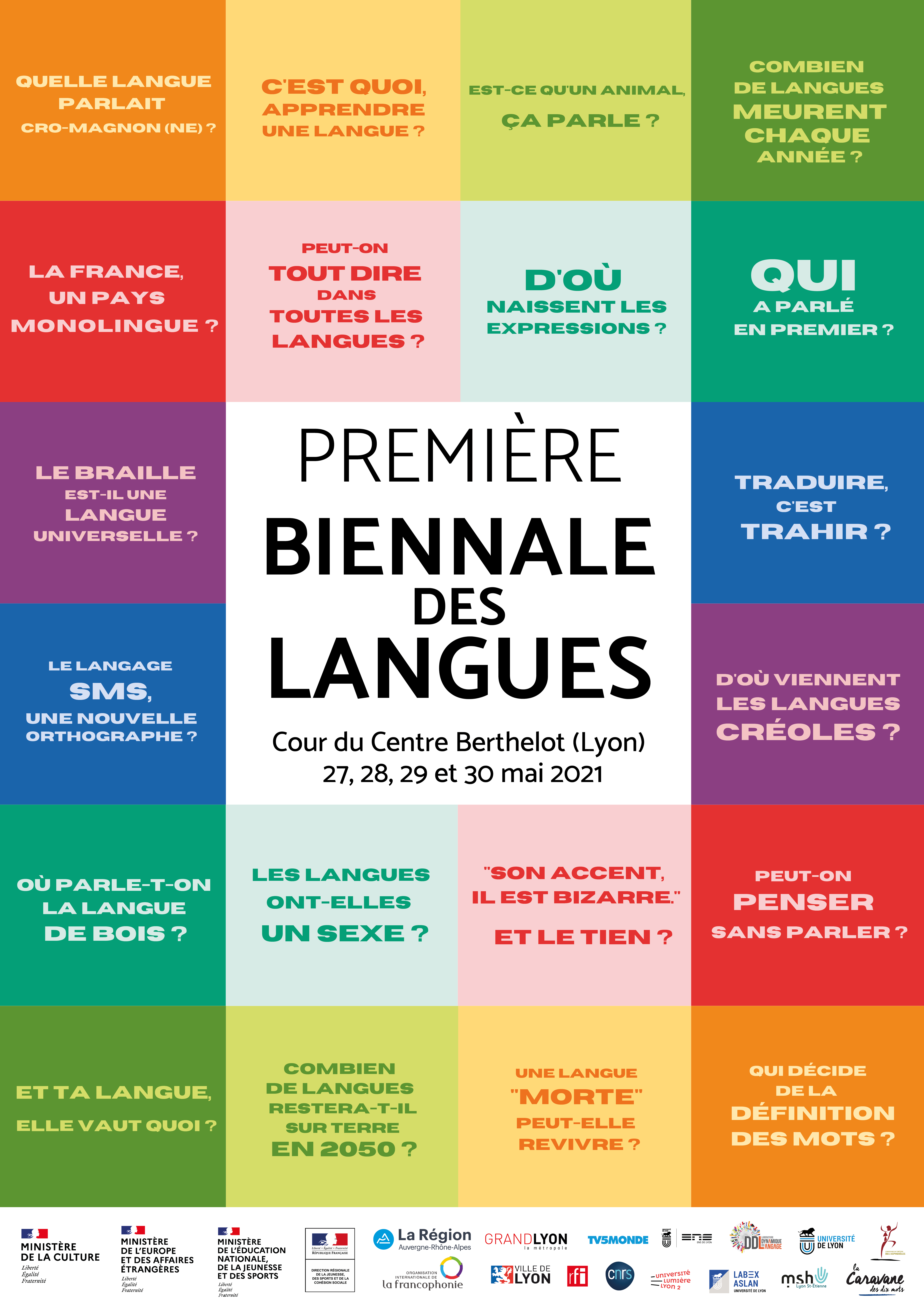 La Première Biennale des Langues c’est un événement inédit qui se tiendra du 27 au 30 mai 2021 à Lyon, dans la cour du Centre Berthelot et dans divers lieux partenaires aux alentours comme le cinéma Comœdia et le rectorat de Lyon. Entièrement gratuite, la Biennale est accessible à tous les citoyens.