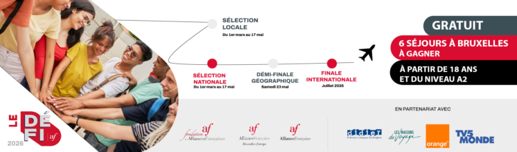 Ce mois de février sonne le lancement du DÉFI 2026. Dans les Alliances Françaises aux quatre coins du monde, les apprenants, âgés d’au moins 18 ans et disposant d’un niveau minimum A2 se préparent à participer aux quiz culturels qui mettent à l’honneur la francophonie dans tous ses états. À l’issue des différentes étapes du concours, organisées successivement au niveau local, régional puis par zones géographiques, sept finalistes seront sélectionnés et invités à participer à la grande finale en présentiel, accueillie par l’Alliance Française de Bruxelles-Europe, en juillet 2026.